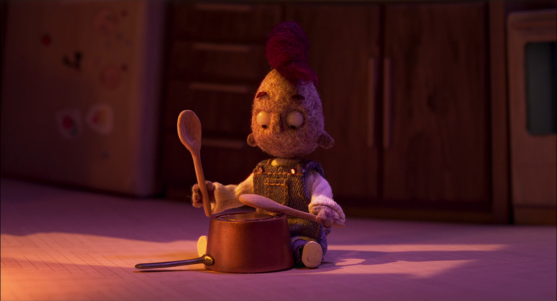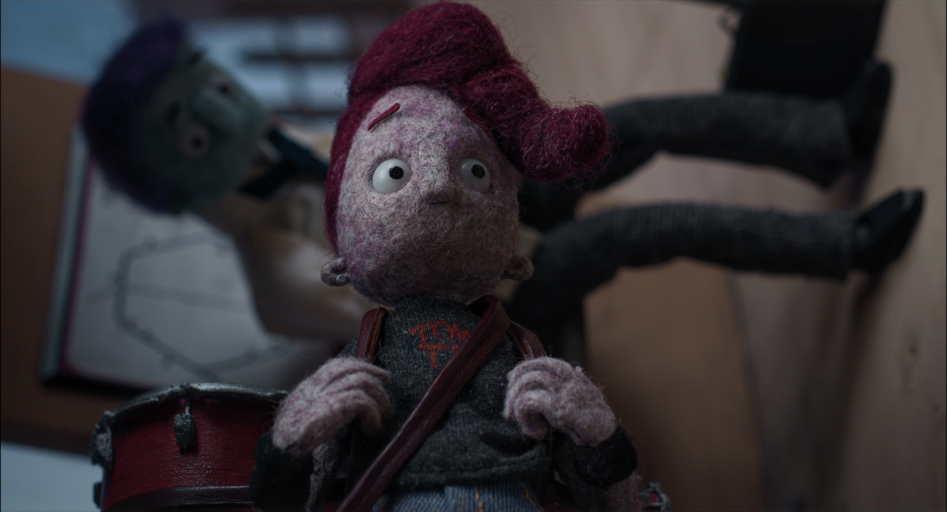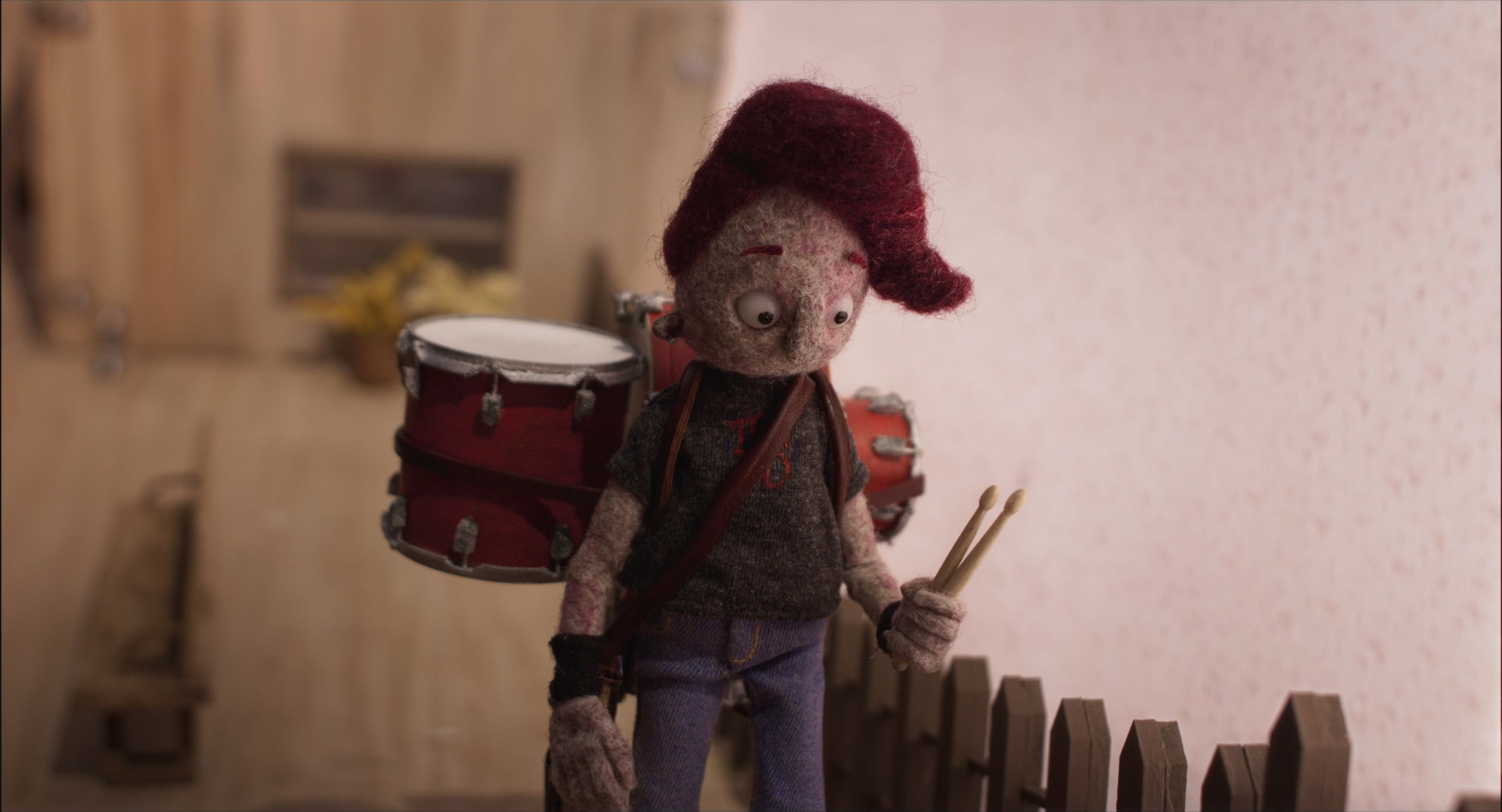 Rich Farris: The set was huge, the full drum set was three metres high, the scene with the falling was animated on the set. At the end we separated the drum into six parts, so for the rest of the film we could animate to a manageable size and then for the very end shot, when the main character was falling, we put them all together.
