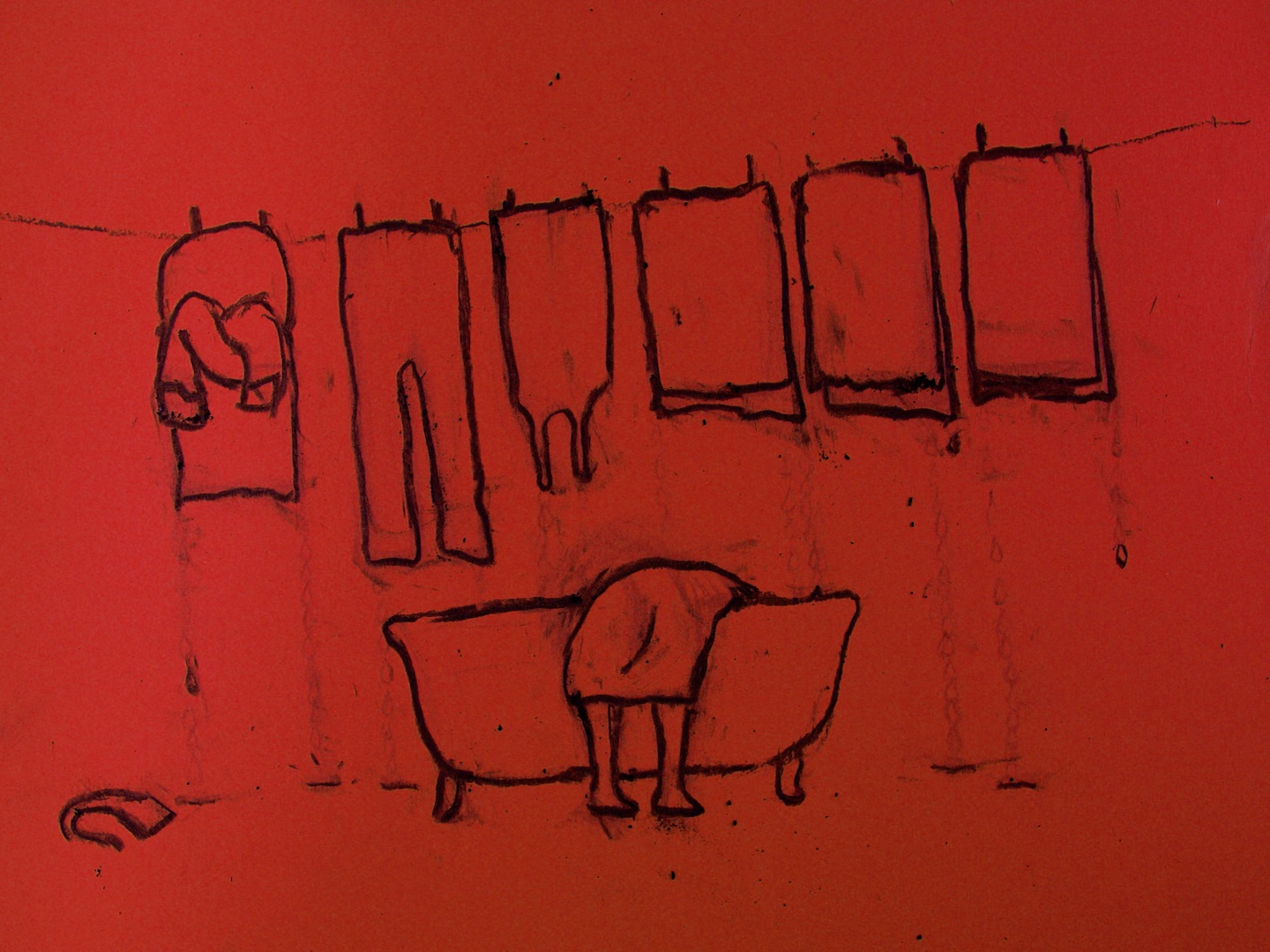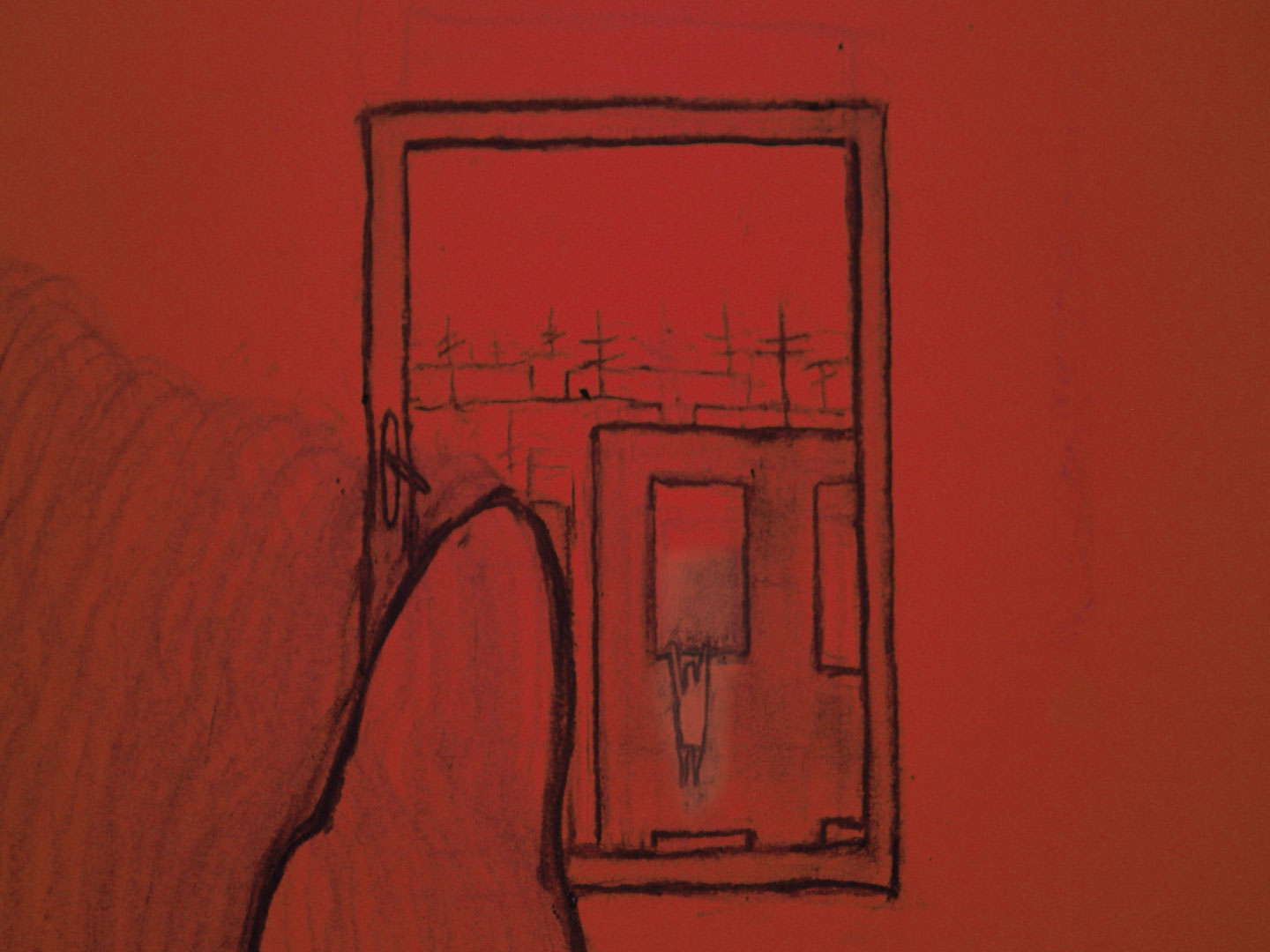 Izabela Plucińska: Red is kind of for courage and for the difficult moment she goes through: when she has to fight. The blue color is kind of relaxed, but maybe not so for relaxing, rather than wanting to come back to herself and to feel clean. We had a lot of symbolic, in what we see is that all the time she focuses on him and not on herself. She became an object, like a laundry. And I want to talk about the technique I used. It is all drawn in charcoal, directly on paper on the camera. It was very new for me, since “Outside” is my second drawn animation.